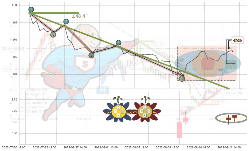➣ 2022-07-04 14:00-2022-08-05 13:00下跌趋势存在反转上涨[机会],其原下跌趋势的阻力位(7.54)已被突破[强支撑信号],原下跌趋势角度: 48.4˚