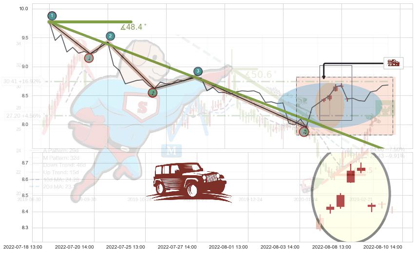 ➢ 2022-07-04 14:00-2022-08-05 13:00下跌趋势存在反转上涨[机会],其原下跌趋势的阻力位(7.54)已被突破[强支撑信号],原下跌趋势角度: 48.4˚