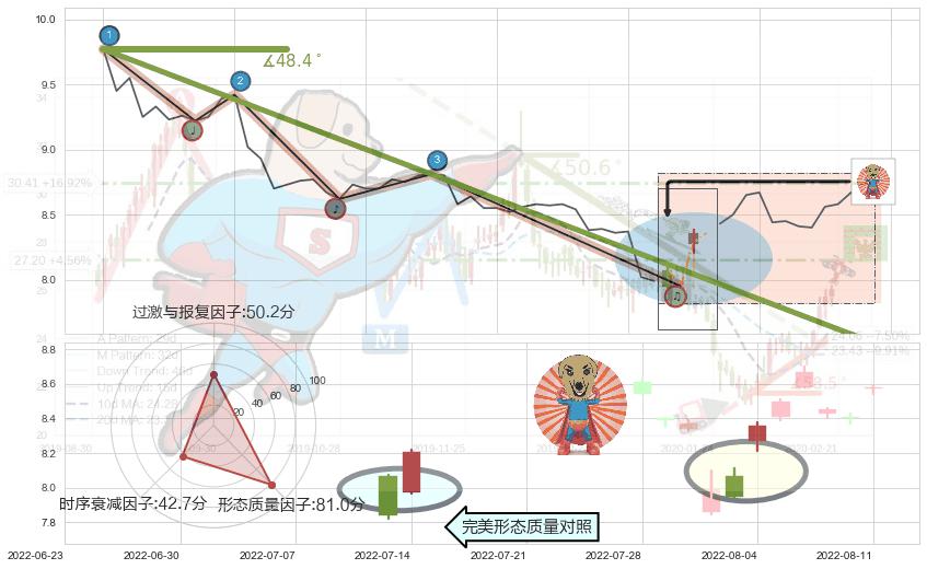 从2022-07-04 14:00至2022-08-05 13:00,共包含48个小时,阶段股价下跌-14.19%,阶段股价变动位移路程比: 1 : 3,下跌趋势角度: 48.4,2022-08-02 13:00向↘︎形成缺口,跳空下跌-4.18%˚