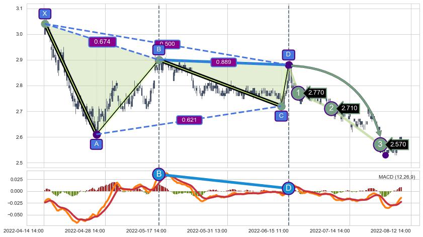 ➢ 谐波价格D点比B点高 ⤴,【MACD】指标D点比B点低 ⤵️