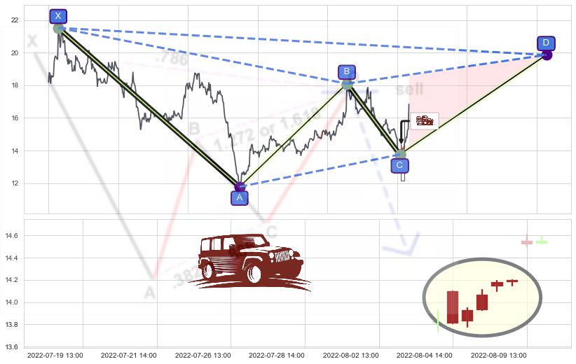 ➢ 谐波伽利:b下跌接近c:猜想支撑性拉升 → 上涨 →【拐点】支撑临近 → 大趋势均值回复