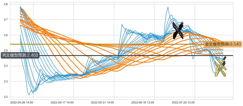 ➢ 30小时均线于(07-05 14:00: 2.639)形成【死叉】基于【死叉历史模型】预测死叉后最低波谷价格: 2.517, 死叉后最低价格2.330,已经下跌超出预测最低波谷价格, 预期反弹