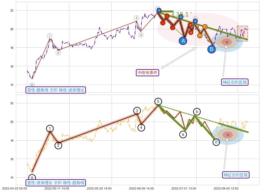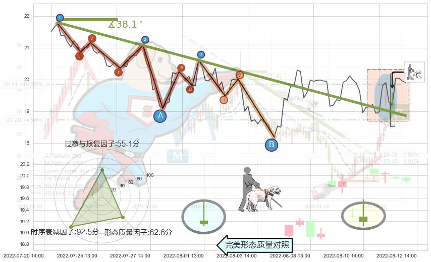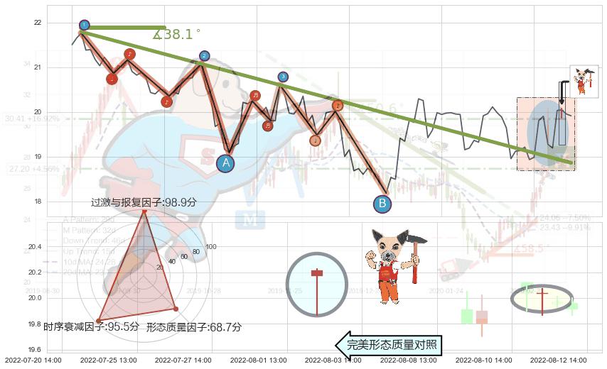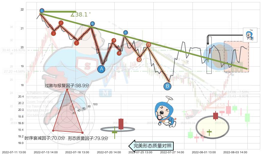 从2022-06-10 14:00至2022-07-20 14:00,共包含73个小时,阶段股价下跌-8.77%,阶段股价变动位移路程比: 1 : 8,下跌趋势角度: 38.1