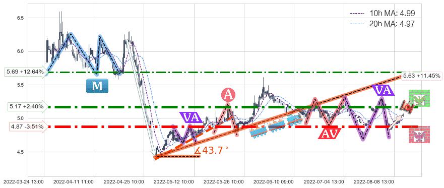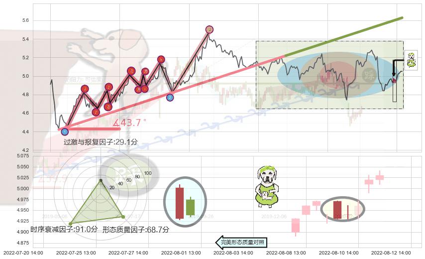 ♘ 阻力价格位5.17,可信任强度87.67%,距离最后交易2022-08-12 14:00形成的收盘价格5.05相差 +2.40%