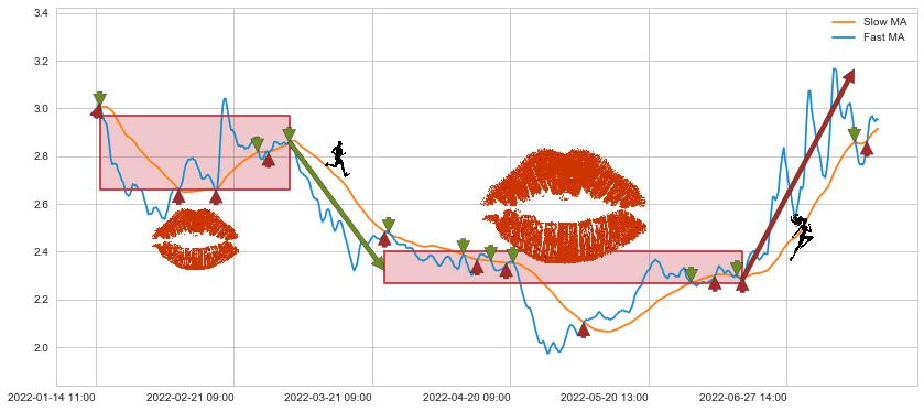 03-22 14:00至06-10 10:00 慢线与快线多次接触,存在上下穿越,有缠绕