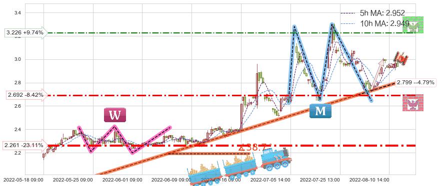 ♘ 阻力价格位3.226,可信任强度54.20%,距离最后交易2022-08-12 14:00形成的收盘价格2.940相差 +9.74%