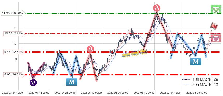 ♘ 支撑价格位9.46,可信任强度94.55%,距离最后交易2022-08-12 14:00形成的收盘价格10.86相差 -12.87%