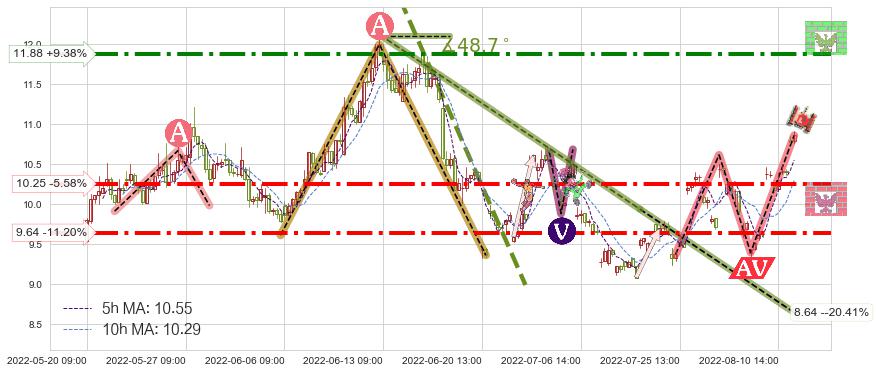 ♘ 支撑价格位10.25,可信任强度82.33%,距离最后交易2022-08-12 14:00形成的收盘价格10.86相差 -5.58%