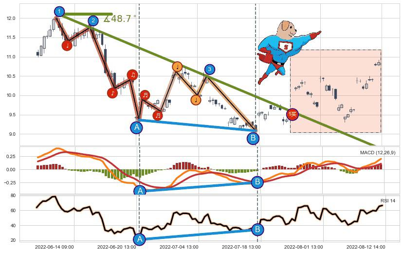 ➢ 2022-06-10 14:00-2022-07-18 13:00下跌趋势存在反转上涨[机会],其原下跌趋势的阻力位(8.64)已被突破[强支撑信号],原下跌趋势角度: 48.7˚