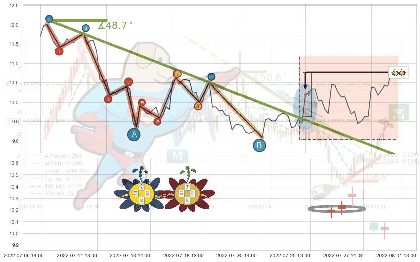 ➣ 2022-06-10 14:00-2022-07-18 13:00下跌趋势存在反转上涨[机会],其原下跌趋势的阻力位(8.64)已被突破[强支撑信号],原下跌趋势角度: 48.7˚