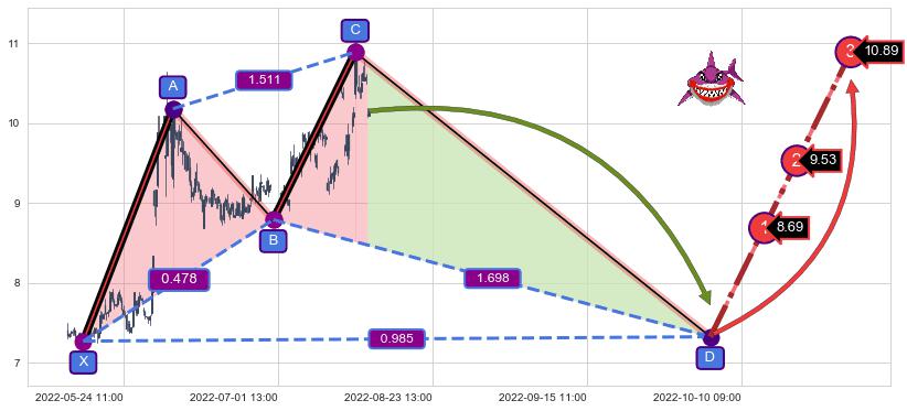 ➣ 谐波鲨鱼:b持续蓄力上拉击穿越过c:猜想泄力性下沉 → 下跌 →【拐点】强阻力临近 → 大趋势均值回复