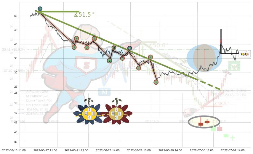 从2022-01-05 11:00至2022-05-31 13:00,共包含472个小时,阶段股价下跌-50.15%,阶段股价变动位移路程比: 1 : 6,下跌趋势角度: 51.5