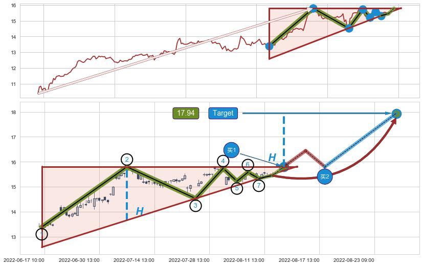 从2022-06-22 14:00至2022-08-01 14:00,共包含57个小时,阶段股价上涨13.49%,阶段股价变动位移路程比: 1 : 3