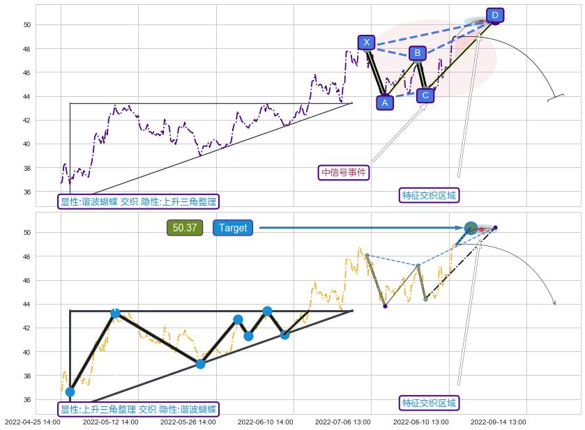➢ 上升三角整理临近target阻力拐点下跌 🔜 谐波蝴蝶临近d拐点下跌阻力 综合量化分数:49.51 【中性】
