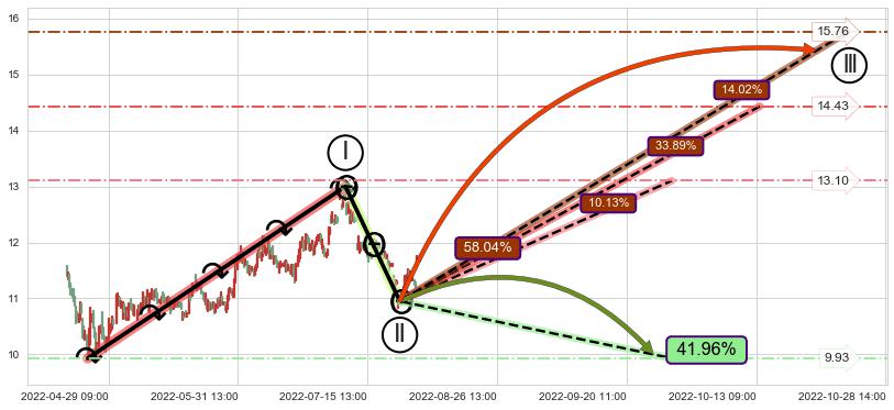 ➣ 循环浪继续向上【平均值】位置(10-13:12, 14.43),匹配聚类样本比例58.39%, 可能性概率33.89%