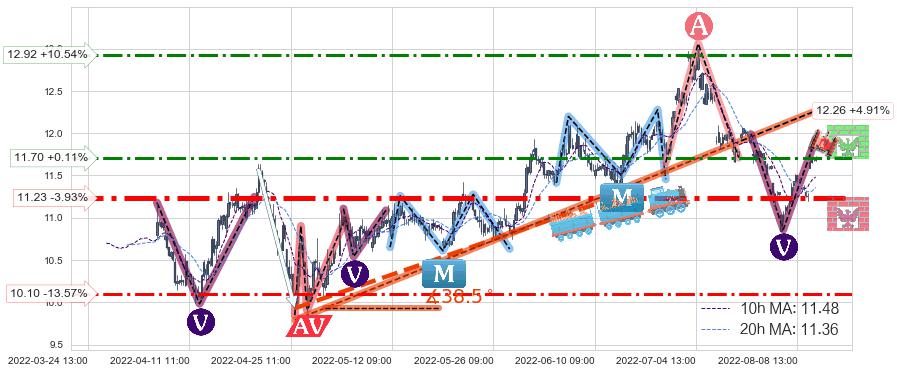 ♘ 阻力价格位11.70,可信任强度62.45%,距离最后交易2022-08-12 14:00形成的收盘价格11.69相差 +0.11%