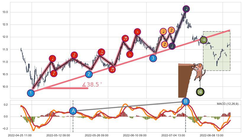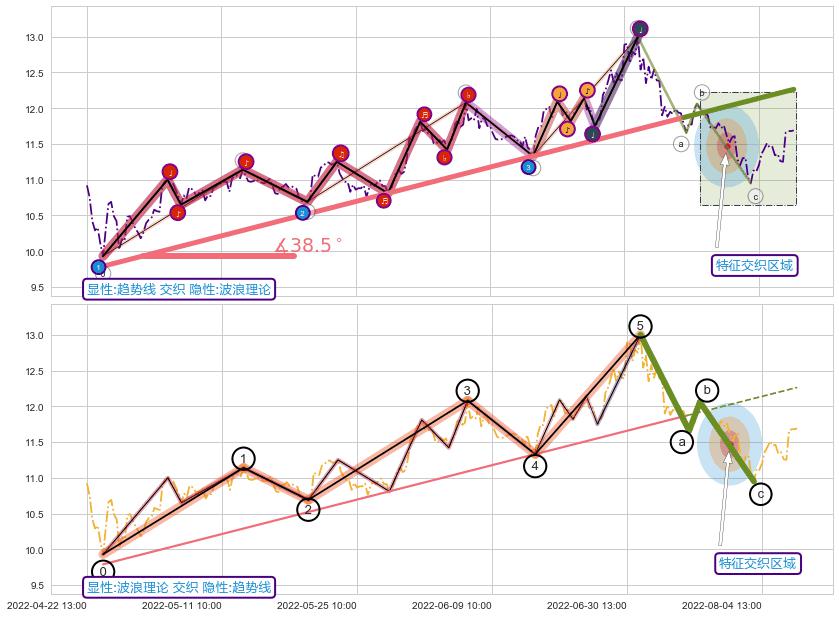 从2022-04-25 14:00至2022-07-15 13:00,共包含217个小时,阶段股价上涨18.54%,阶段股价变动位移路程比: 1 : 9,上涨趋势角度: 38.5