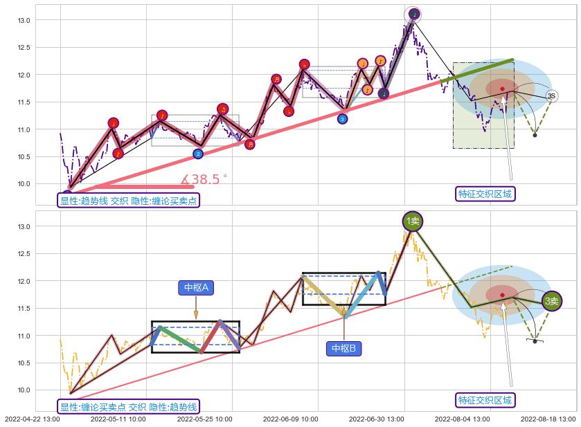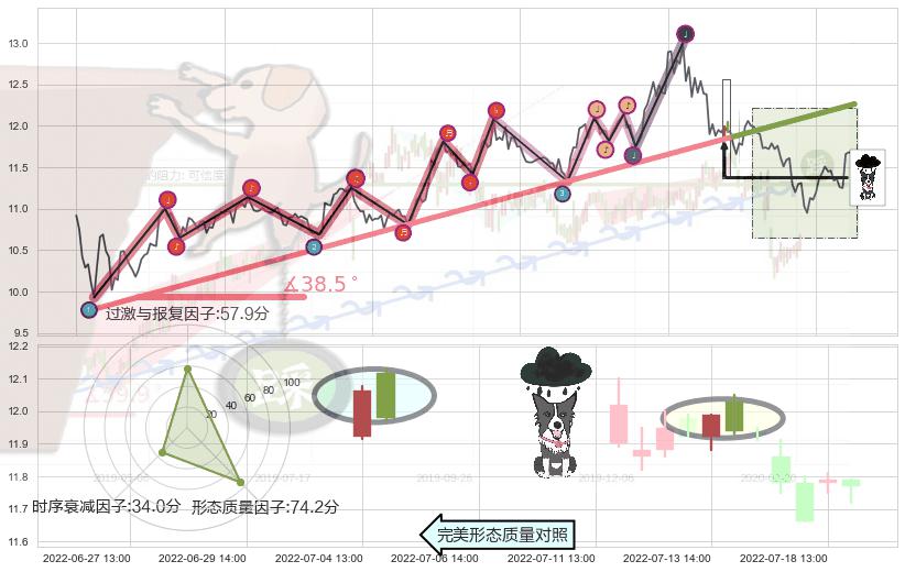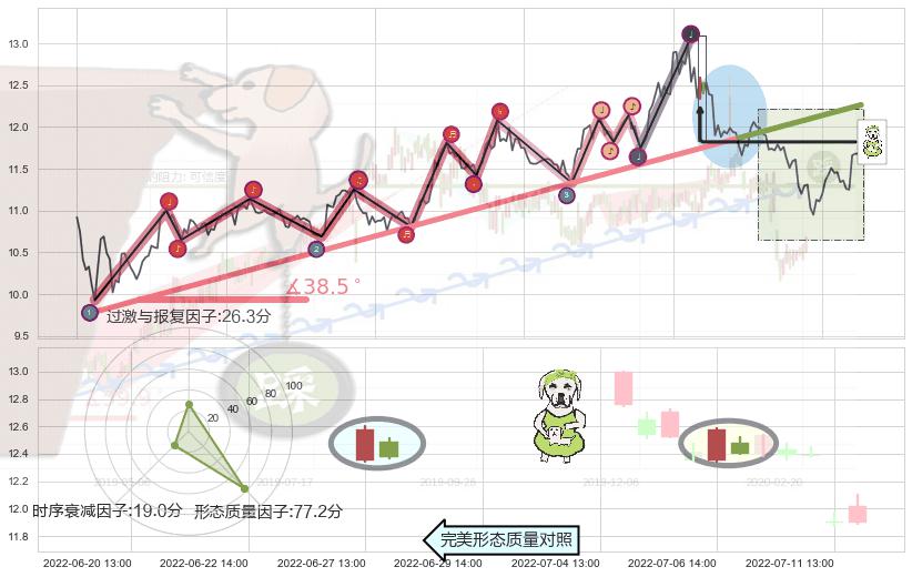 ➢ 2022-04-25 14:00-2022-07-15 13:00上升趋势存在反转[风险],其原上升趋势的支撑位(12.26)已破位[强阻力信号],原上升趋势角度: 38.5˚