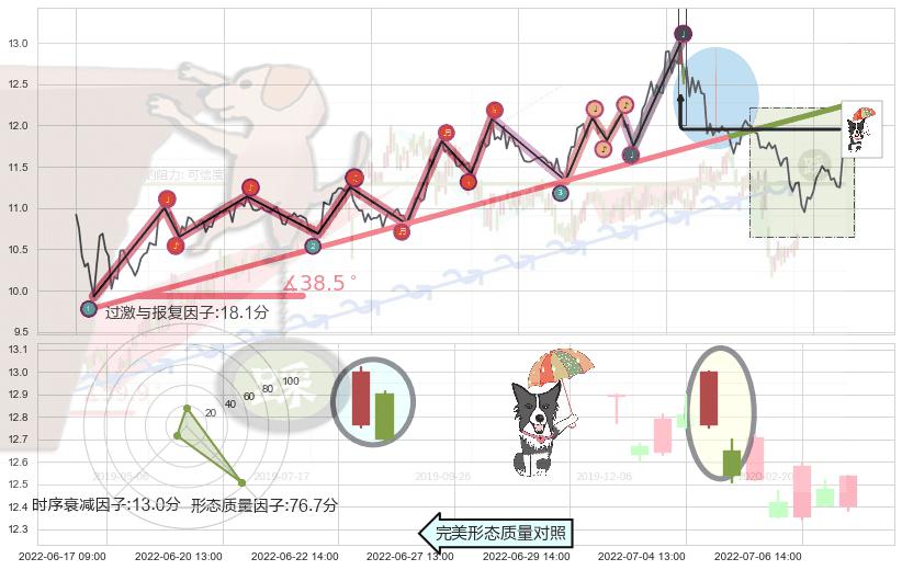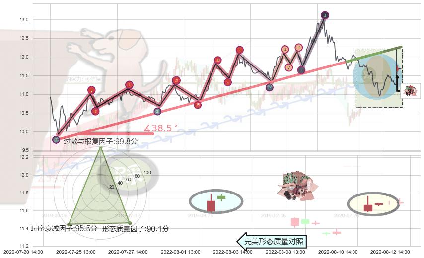 ➣ 2022-04-25 14:00-2022-07-15 13:00上升趋势存在反转[风险],其原上升趋势的支撑位(12.26)已破位[强阻力信号],原上升趋势角度: 38.5˚