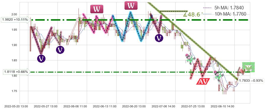 ♘ 阻力价格位1.9820,可信任强度98.68%,距离最后交易2022-08-12 14:00形成的收盘价格1.8000相差 +10.11%