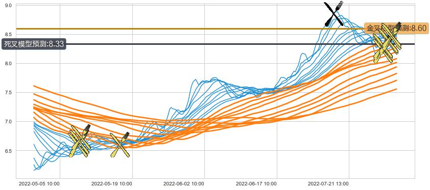 ➢ 5小时均线于(07-13 14:00: 8.85)形成【死叉】基于【死叉历史模型】预测死叉后最低波谷价格: 8.33, 死叉后最低价格7.95,已经下跌超出预测最低波谷价格, 预期反弹