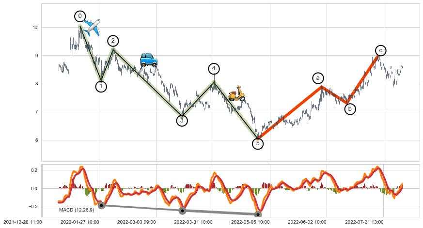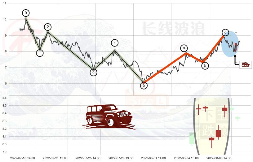 ➣ 波浪理论:猜想达到c点后小反弹终止反转下跌 → 下跌 → 【拐点】临近 → 阶段均值回复结束后继续大周期趋势跟踪