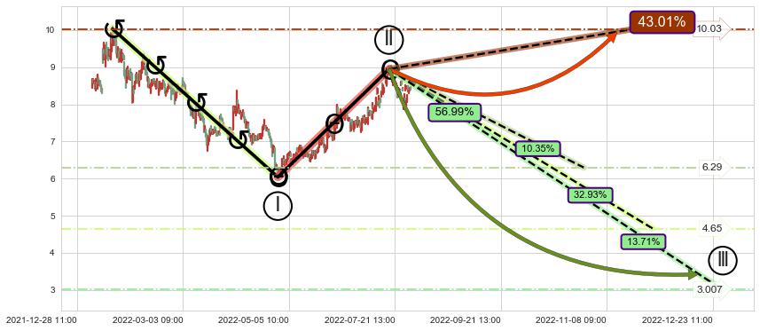 ➣ 调整浪已超过预测的c点位置,后续大趋势循环浪继续下跌概率56.99%,谨慎做多