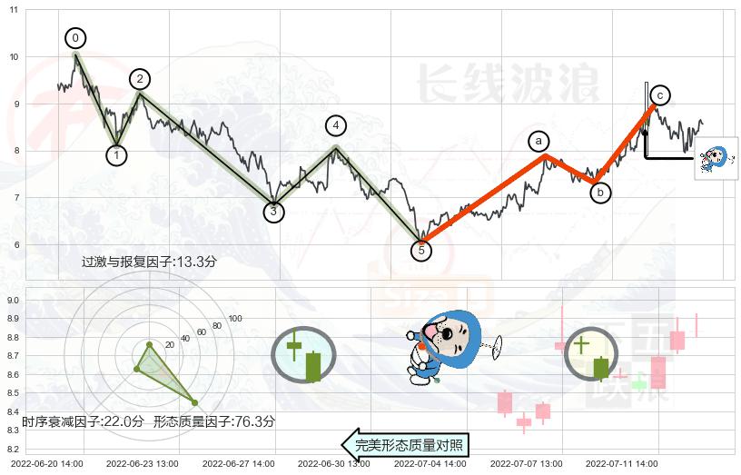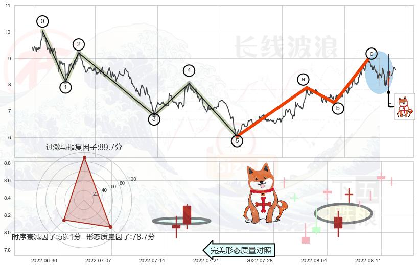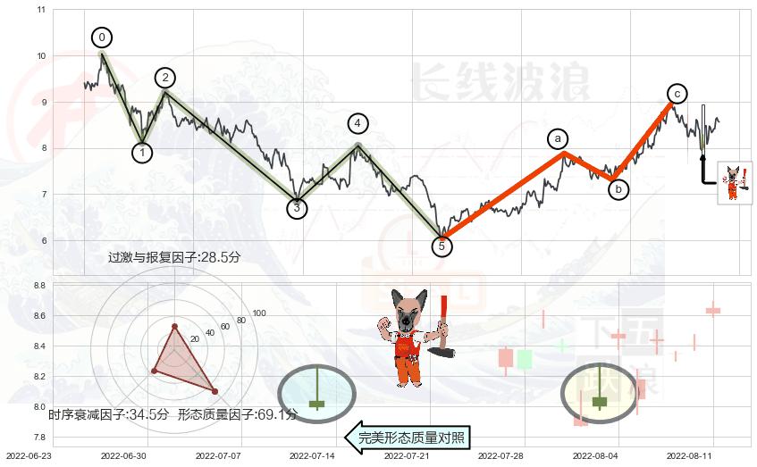 从2022-06-30 14:00至2022-08-12 14:00,共包含63个小时,阶段股价上涨8.05%,阶段股价变动位移路程比: 1 : 10