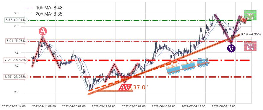 ♘ 阻力价格位8.73,可信任强度57.96%,距离最后交易2022-08-12 14:00形成的收盘价格8.56相差 +2.01%
