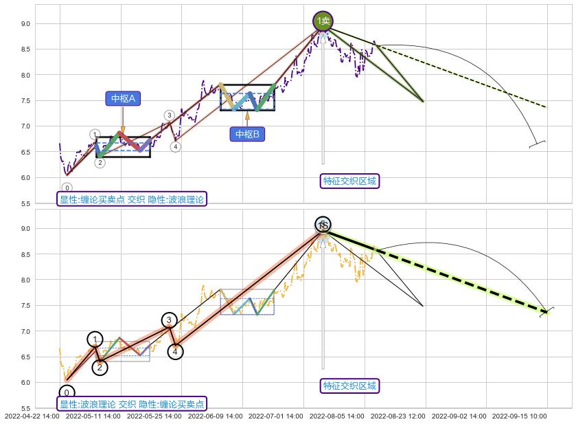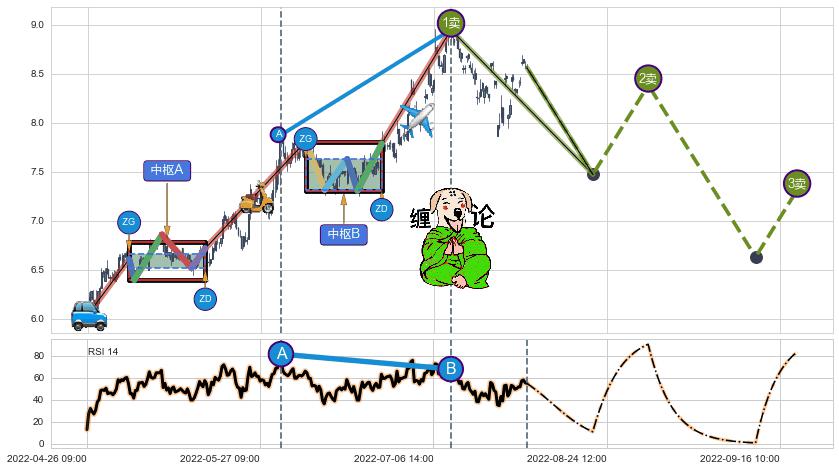 ➣ 缠论买卖点:上升缠中枢AB形成后猜想拐点1卖已到达,猜想后续持续下跌(均值回复)