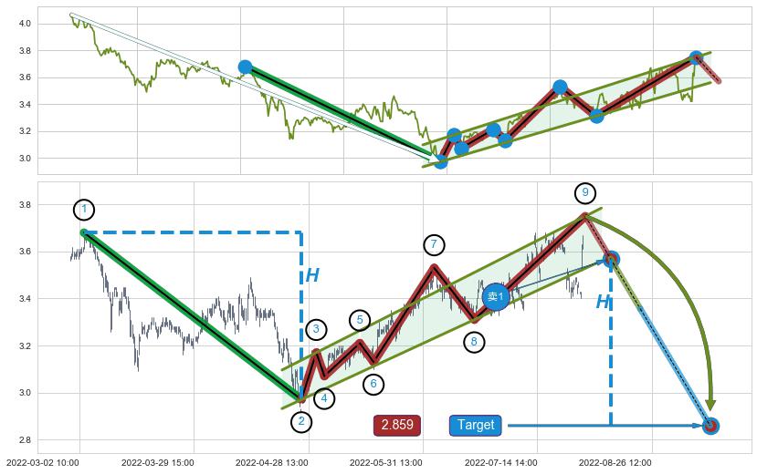 ➣ 升旗形:猜想临近关键支撑位突破点 → 临近拐点下跌 → 风险信号 → 大趋势均值回复
