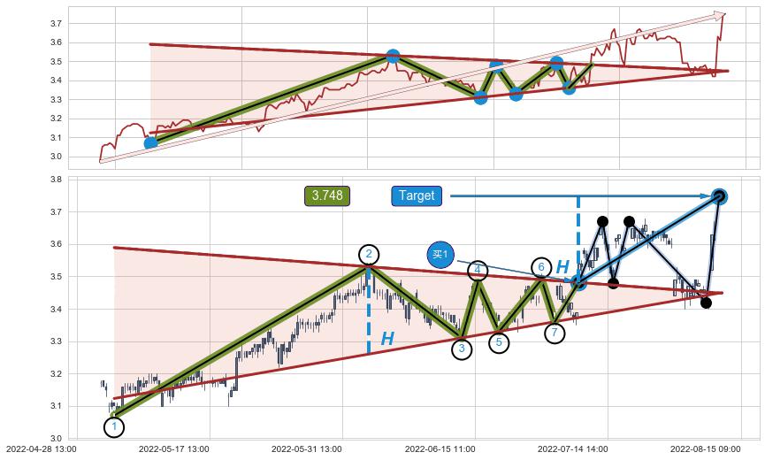 ➣ 最小中继整理涨幅→𝐇: 0.180000 (上平行阻力线与下平行支撑线的垂直距离)