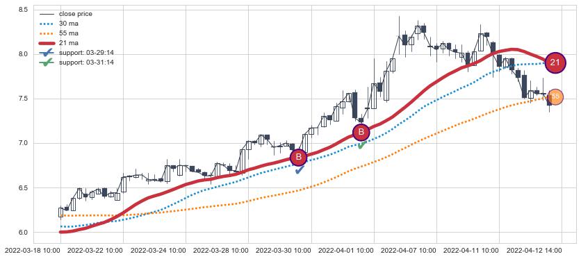 ➢ 最优均线组合共正确确认支撑阻力信号9处,正确确认率 64.29%