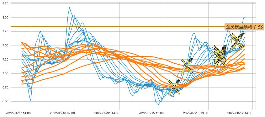➣ 10小时均线于(08-05 14:00: 7.56)形成【金叉】基于【金叉历史模型】预测金叉后最高波峰价格: 7.81, 金叉后最高价格8.06,已经上涨超出预测最高波峰价格, 预期回调