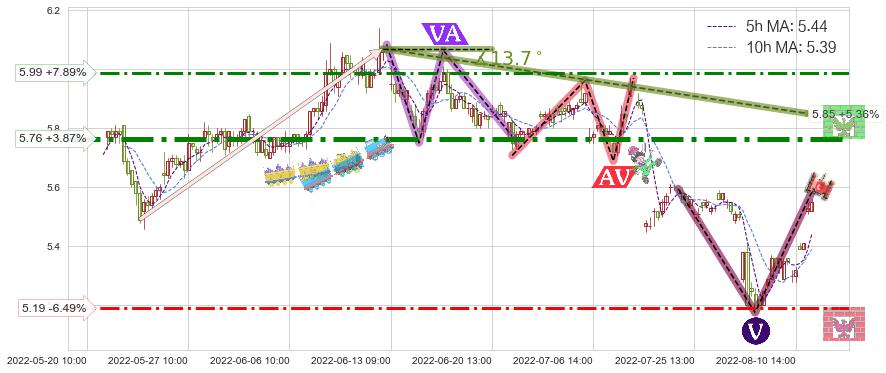 ♘ 阻力价格位5.99,可信任强度67.07%,距离最后交易2022-08-12 14:00形成的收盘价格5.55相差 +7.89%