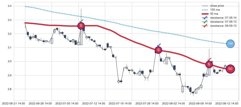 ➢ 最优均线组合共正确确认支撑阻力信号5处,正确确认率 83.33%