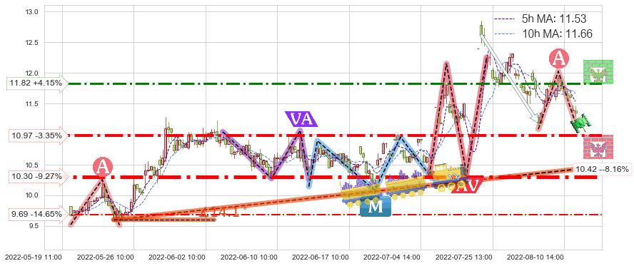 ♘ 阻力价格位11.82,可信任强度65.75%,距离最后交易2022-08-12 14:00形成的收盘价格11.35相差 +4.15%