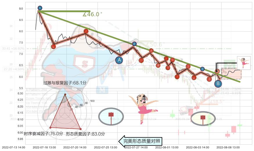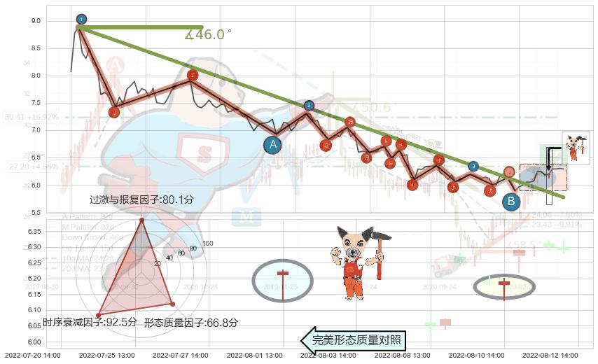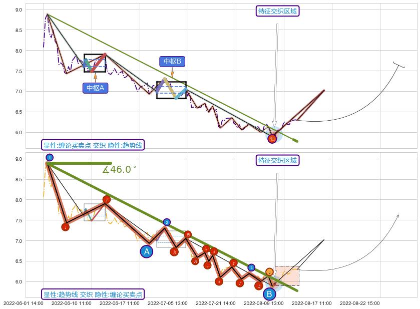 从2022-06-02 10:00至2022-08-02 13:00,共包含114个小时,阶段股价下跌-34.39%,阶段股价变动位移路程比: 1 : 4,下跌趋势角度: 47.4