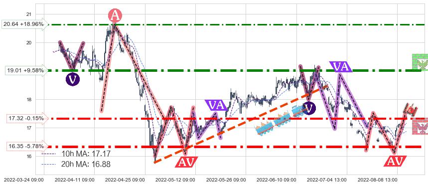 ♘ 阻力价格位19.01,可信任强度91.80%,距离最后交易2022-08-12 14:00形成的收盘价格17.35相差 +9.58%