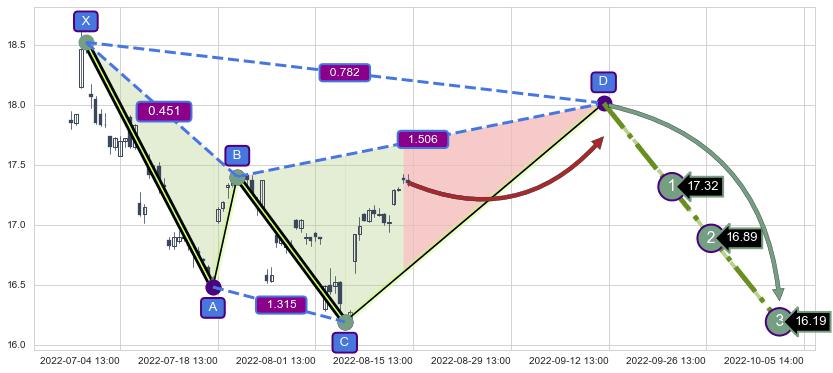 ➣ 谐波蝴蝶:c下跌到达d:猜想拉升 → 上涨 →【拐点】强支撑临近 → 大趋势均值回复