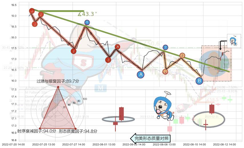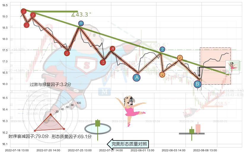 ➢ 2022-06-15 13:00-2022-08-05 13:00下跌趋势存在反转上涨[机会],其原下跌趋势的阻力位(16.41)已被突破[强支撑信号],原下跌趋势角度: 43.3˚