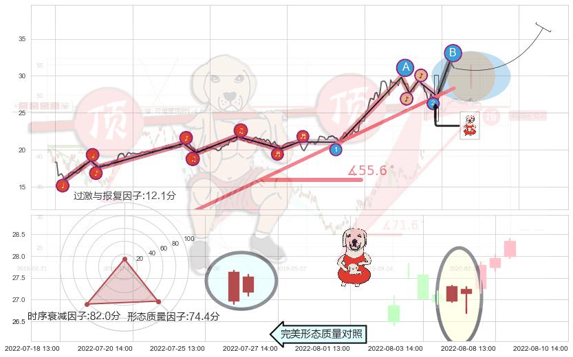 从2022-04-27 09:00至2022-08-12 14:00,共包含253个小时,阶段股价上涨70.01%,阶段股价变动位移路程比: 1 : 3,上涨趋势角度: 55.6