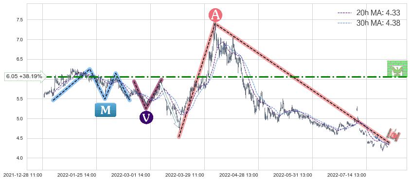♞ 20小时均线:4.33,30小时均线:4.38→ 快线<慢线
