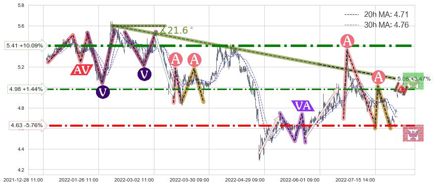 ♘ 阻力价格位4.98,可信任强度55.80%,距离最后交易2022-08-12 14:00形成的收盘价格4.91相差 +1.44%