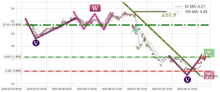 ♘ 阻力价格位4.63,可信任强度64.29%,距离最后交易2022-08-12 14:00形成的收盘价格4.56相差 +1.45%