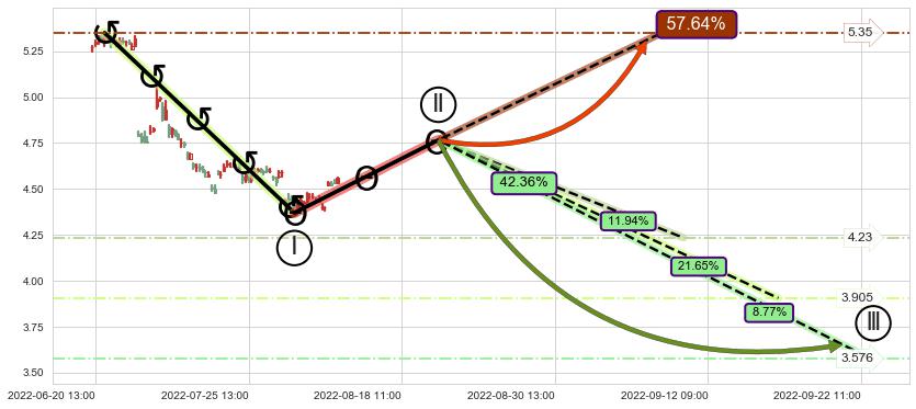 ➢ 循环浪继续向下【最低】位置(09-22:14, 3.576),匹配聚类样本比例20.71%, 可能性概率8.77%