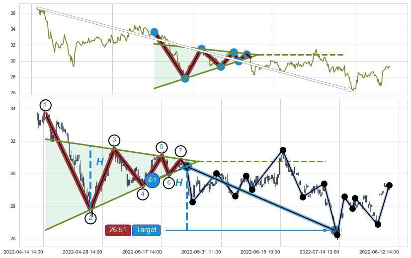 从2022-03-14 09:00至2022-04-26 14:00,共包含150个小时,阶段股价下跌-16.96%,阶段股价变动位移路程比: 1 : 7