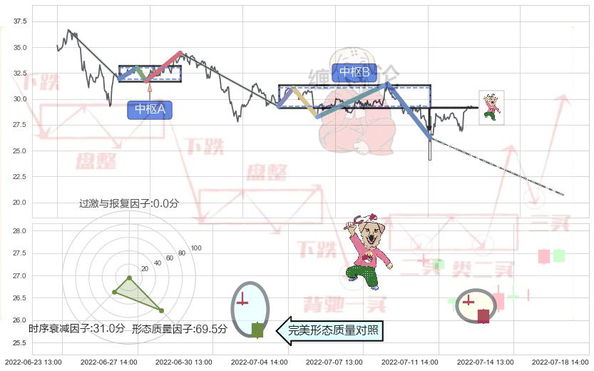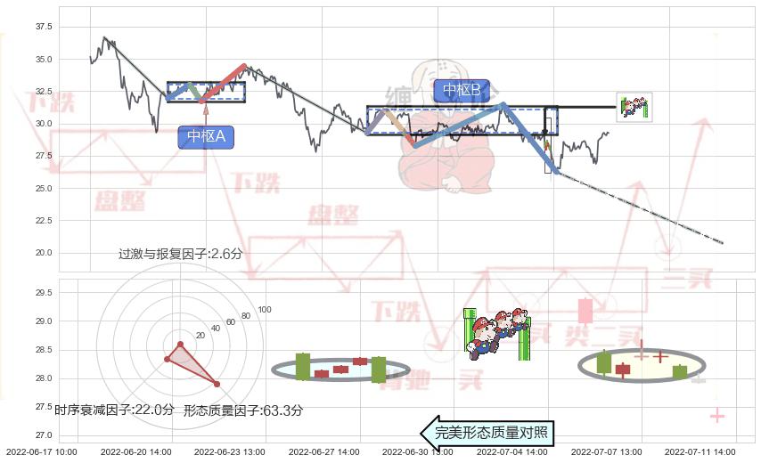从2022-03-03 10:00至2022-07-15 14:00,共包含397个小时,阶段股价下跌-26.48%,阶段股价变动位移路程比: 1 : 13,下跌趋势角度: 31.1