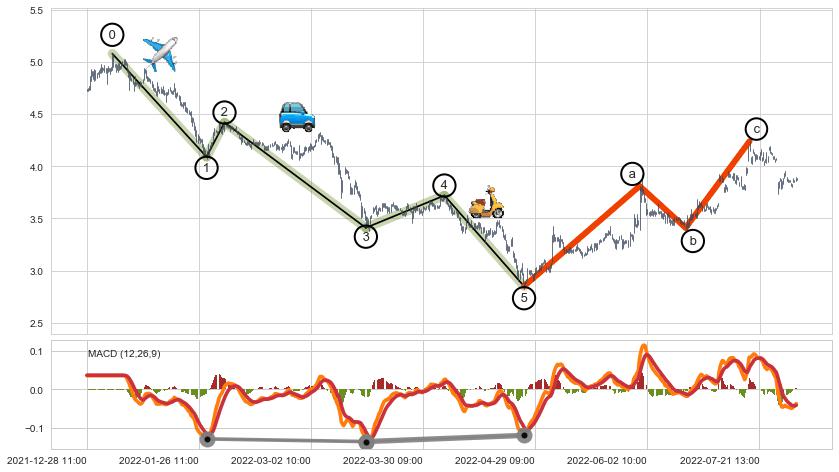 ➢ 波浪理论:猜想达到c点后小反弹终止反转下跌 → 下跌 → 【拐点】临近 → 阶段均值回复结束后继续大周期趋势跟踪