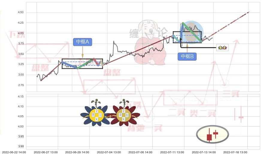 ➣ 【中枢B】:07-05:14-08-02:14,中枢由4笔构成,共41交易小时, ZG=3.940, ZD=3.790